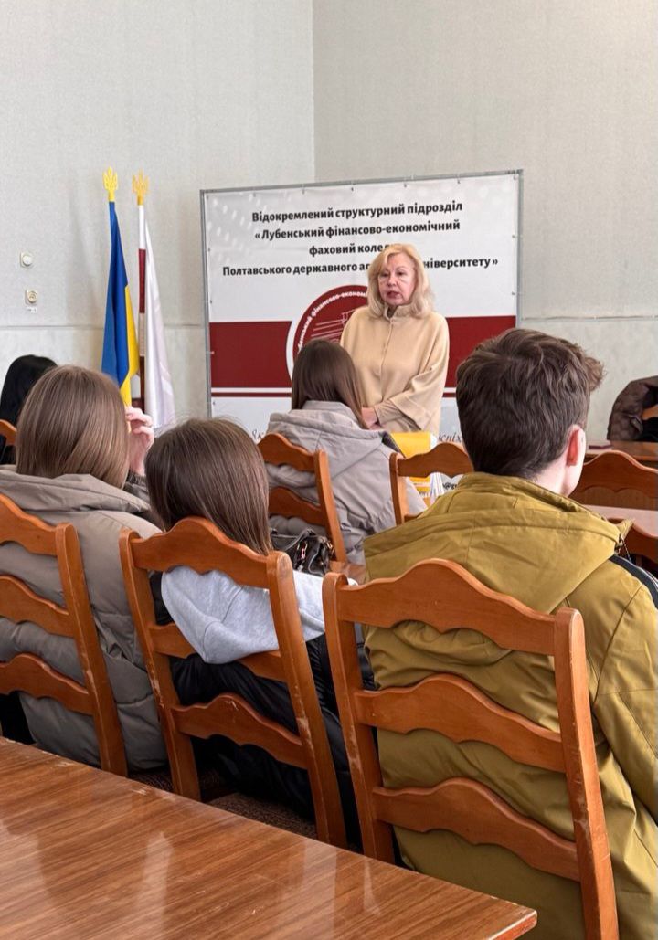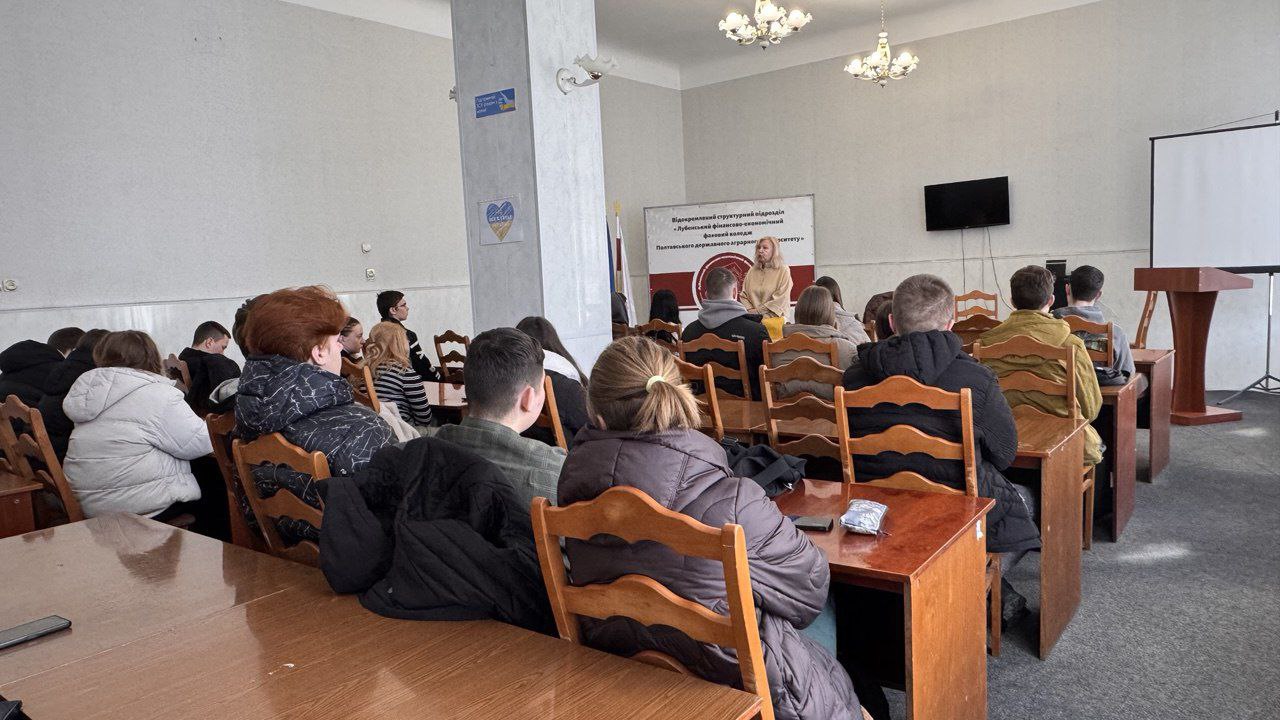 09 березня у Відокремленому структурному підрозділі «Лубенський фінансово-економічний фаховий коледж ПДАУ» відбулася зустріч здобувачів освіти 2 та 3 курсів із провідним фахівцем з профорієнтації Лубенської філії Полтавського обласного центру зайнятості Тетяною Манжарою.